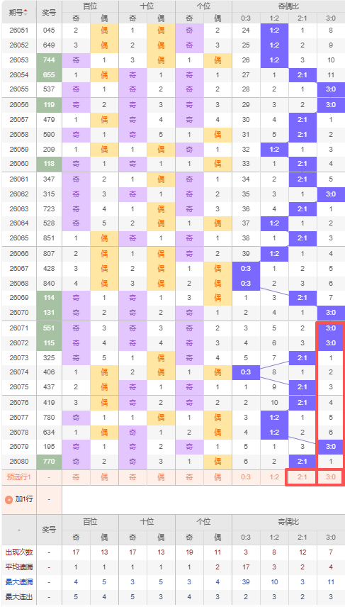 上期奇偶比:2:1,近10期奇偶比出现情况:3:0、3:0、2:1、0:3、2:1、2:1、1:2、1:2、3:0、2:1,最近10期出现4期2:1,出现2期1:2,出现1期0:3,出现3期3:0,根据近10期出号规律本期推荐连出的2:1,防隔期出3:0,综上所述奇偶比推荐:3:0,重点关注:2:1。