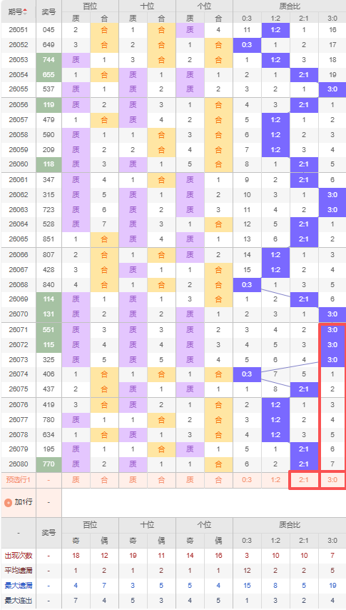 上期质合比:2:1,近10期质合比出现情况:3:0、3:0、3:0、0:3、2:1、1:2、1:2、1:2、2:1、2:1,最近10期出现3期2:1,出现3期1:2,出现1期0:3,出现3期3:0,根据近10期规律本期推荐三连出2:1,防遗漏7期出3:0,综上所述质合比推荐:3:0,重点关注:2:1。