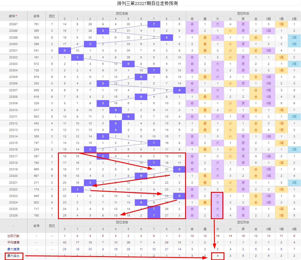 从走势上来说,第23325期和第23325期百位连出两次7,即上期百位上的7直落,已达到百位7最大连出,本期不会再出7。