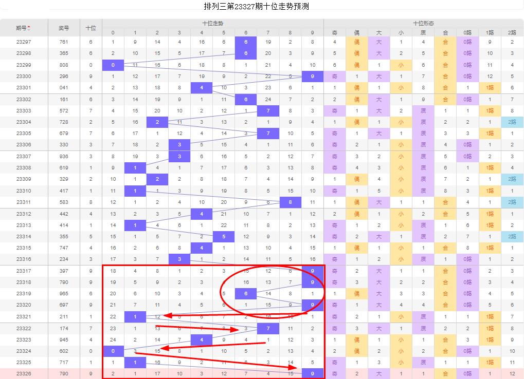 从走势上来说,上期(第23326期)十位数字已到最大数字9,按照近十期十位数字分布趋势上来看,本期十位数字开始回落,但不确定本期十位数字是否会直落,所以本期0-9都可能出。