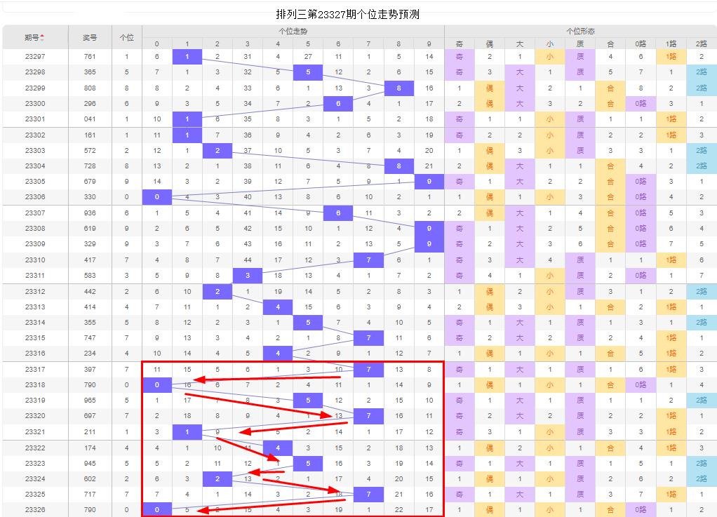 上期(第23326期)个位数字为0,按照近10期内分布规律来看,已达到最小,本期个位数字应往上走,即本期个位数字应为0-7。