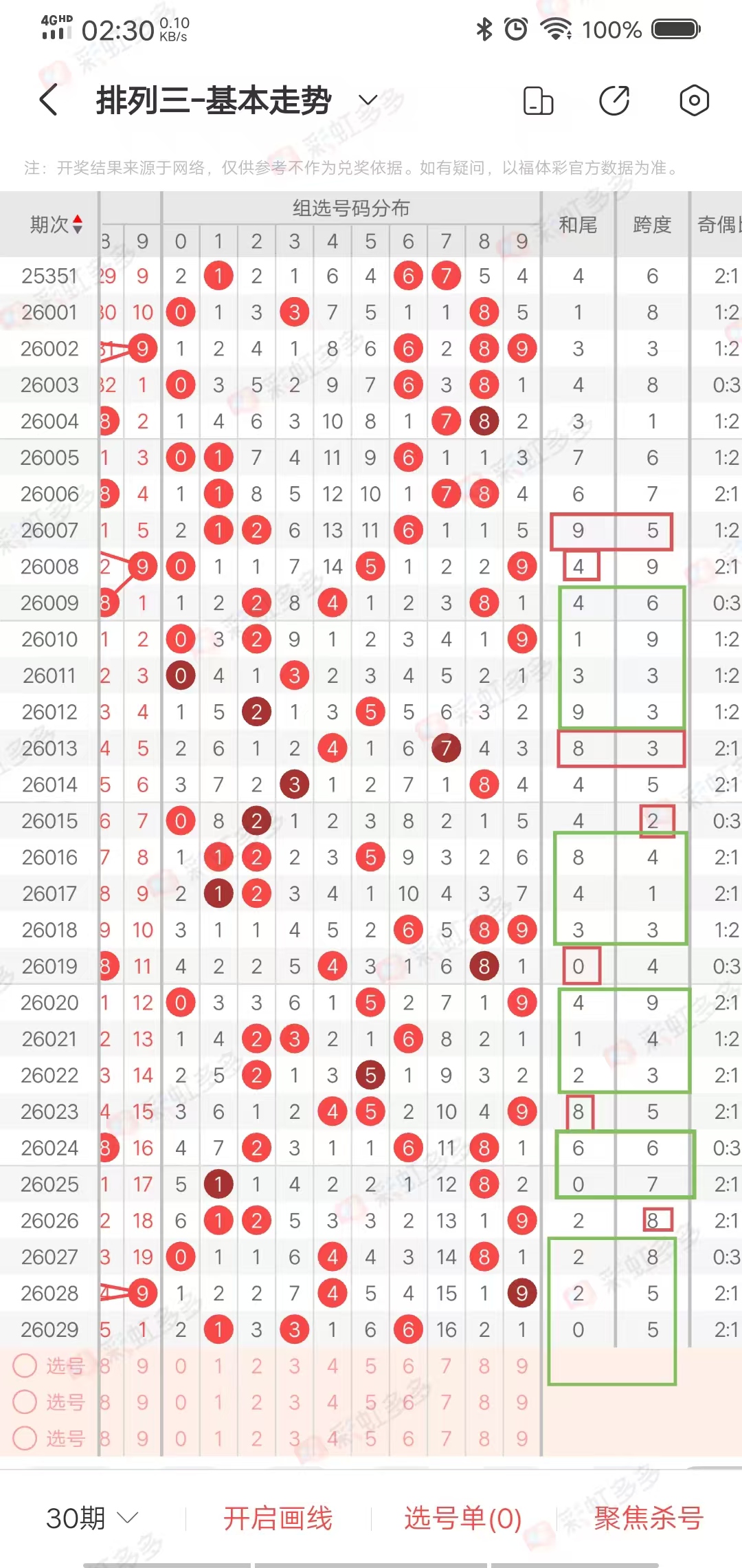 从近30期走势图,我们可以看出,上期和值尾和上期跨度,有很大概率不会出现在本期开奖号码,我们可以参考为杀号,上期和尾出现的概率是30期出8期,出号走势为1000001111,00001,000001,0001,00000,目前遗漏5期,有出号概率,上期和尾0,本期可以当作预防,5号是上期跨度,跨度出现下期的概率是7/30,出号走势为001,011,001,000001,01,0000000001,00,目前遗漏2期,有出号概率,本期可以当作预防,两个号同时出现极少,近30期同时出现2次,作为条件05可以选择0-1个出号,