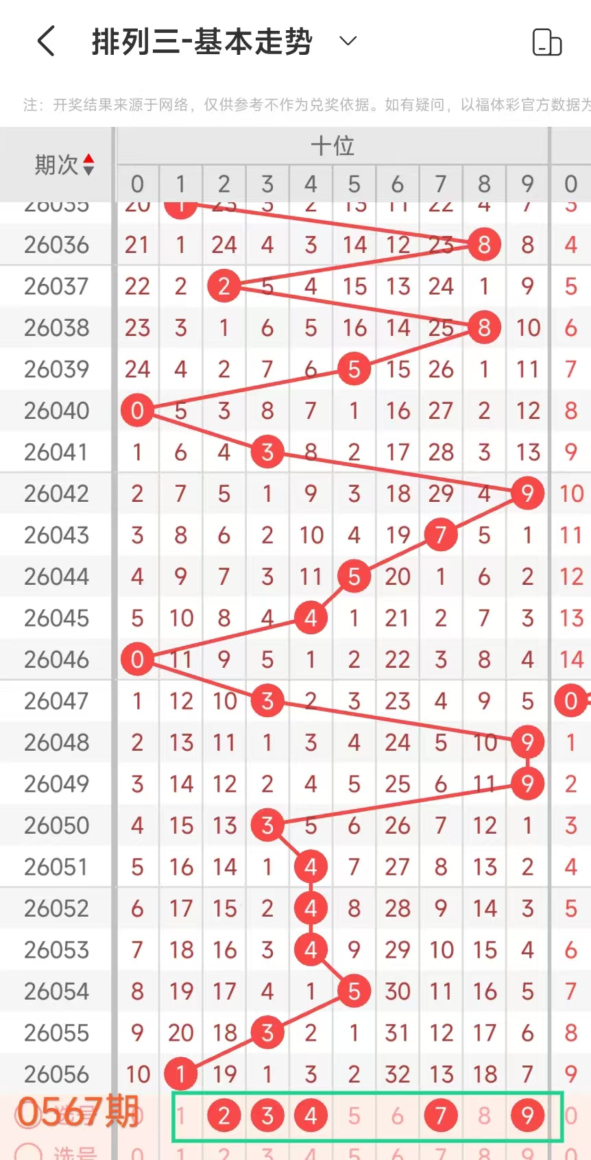 经统计0号出现3次、1号出现7次、2号出现4次、3号出现6次、4号出现4次、5号出7次、6号出现8次、7号出9次、8号出现3次、9号出现6次.统计后出现次数靠前的数字作为我们的备选号码.其号码有135679等
