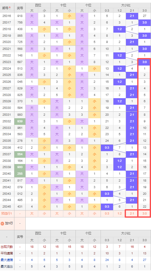 上期大小比:0:3,近10期大小比出现情况:0:3、2:1、1:2、1:2、2:1、2:1、2:1、0:3、2:1、0:3,最近10期出5期2:1,出现2期1:2,出现3期0:3,出现0期3:0,根据近10期出号规律本期推荐隔期出2:1,防遗漏22期出3:0,综上所述大小比推荐:防:3:0,重点关注:2:1。
