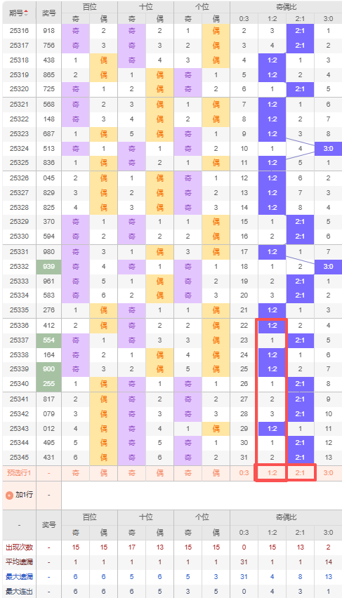 上期奇偶比:2:1,近10期奇偶比出现情况:1:2、2:1、1:2、1:2、2:1、2:1、2:1、1:2、2:1、2:1,最近10期出现6期2:1,出现4期1:2,出现0期0:3,出现0期3:0,根据近10期出号规律本期推荐三连出2:1,防遗漏2期出1:2,综上所述奇偶比推荐:防:1:2,重点关注:2:1。