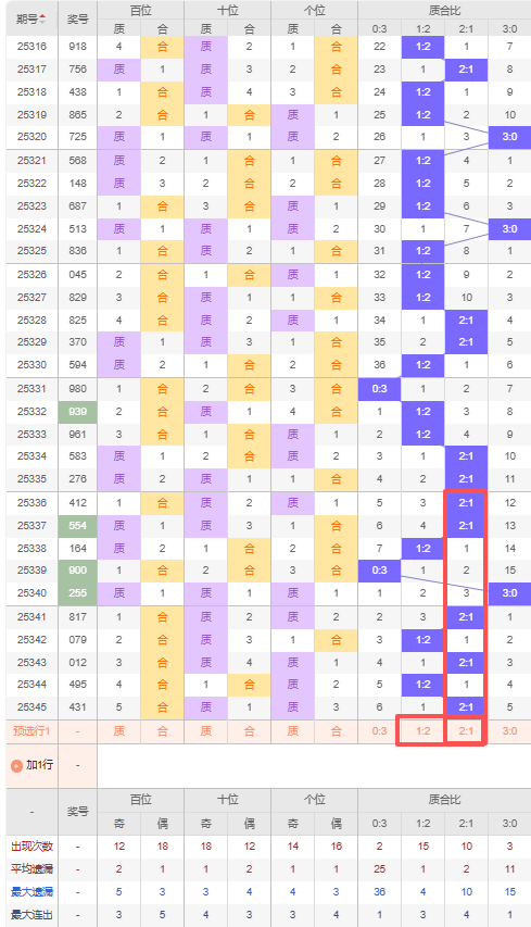 上期质合比:2:1,近10期质合比出现情况:2:1、2:1、1:2、0:3、3:0、2:1、1:2、2:1、1:2、2:1,最近10期出现5期2:1,出现3期1:2,出现1期0:3,出现1期3:0,根据近10期规律本期推荐连出2:1,防隔期出1:2,综上所述质合比推荐:防:1:2,重点关注:2:1。