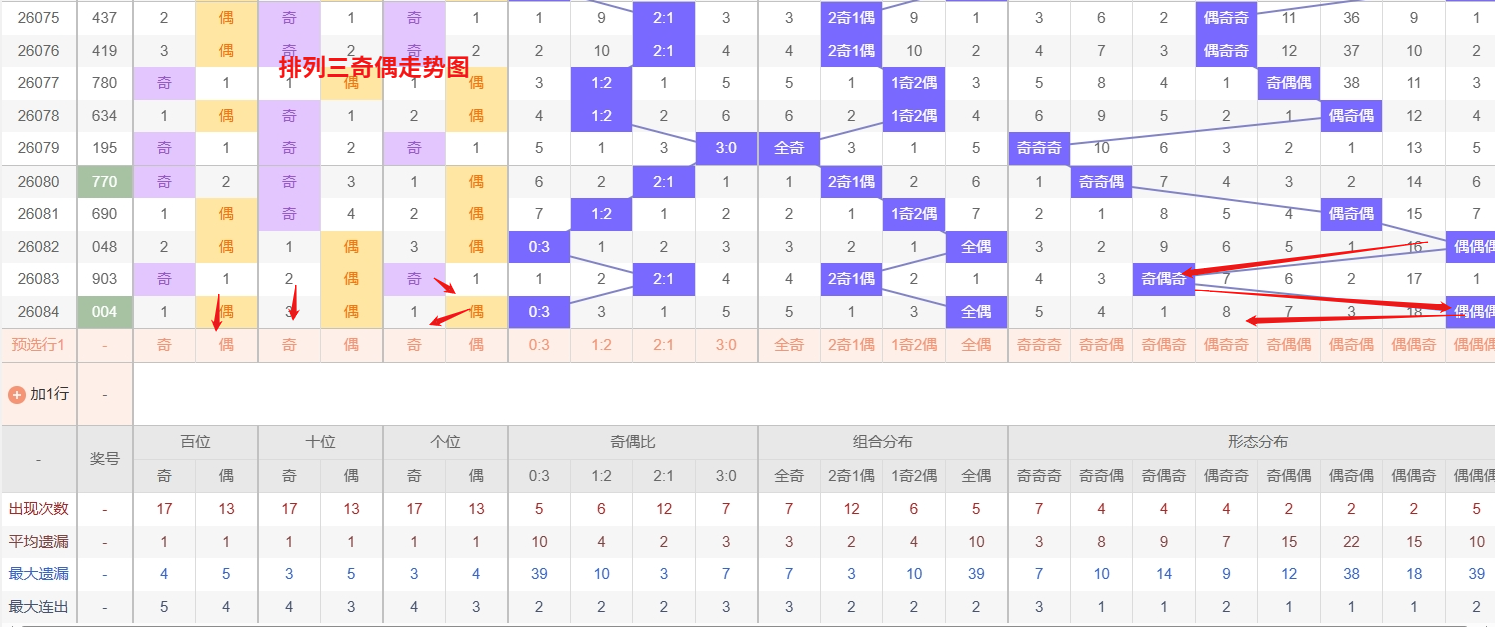 排列三 奇偶分析:从上图可以看出排列三100期内百位奇偶比约为53比47,十位奇偶比为55比45,个位奇偶比为51比49,个位的比值比较均衡,但是十位的比值偏差就有点大,历史奇偶形态近2期开出偶偶偶后下一期的走势为,第002期开出偶偶偶后003期开偶奇奇, 第014期开出偶偶偶后第015期开偶偶奇,第032期开出偶偶偶后第033期开奇偶偶,排列三奇偶走势中,近期偶偶奇组合作为冷态已长时间未开出,从形态轮动及回补规律来看,其遗漏值已进入较高区间,未来几期出现反弹的概率明显增加,尤其在整体偶数回暖或百位、十位连续偶数的带动下,该组合有望迎来补开;与此同时,偶奇奇则属于当前的热号形态,近期出现频率较高,热度尚未明显减退,往往在热势惯性中容易继续表现,需防范其连开或隔期重复的可能。所以排列三2026085期奇偶形态推偶奇奇与偶偶奇。本文由一起彩钱是生命动力所著,请勿转载