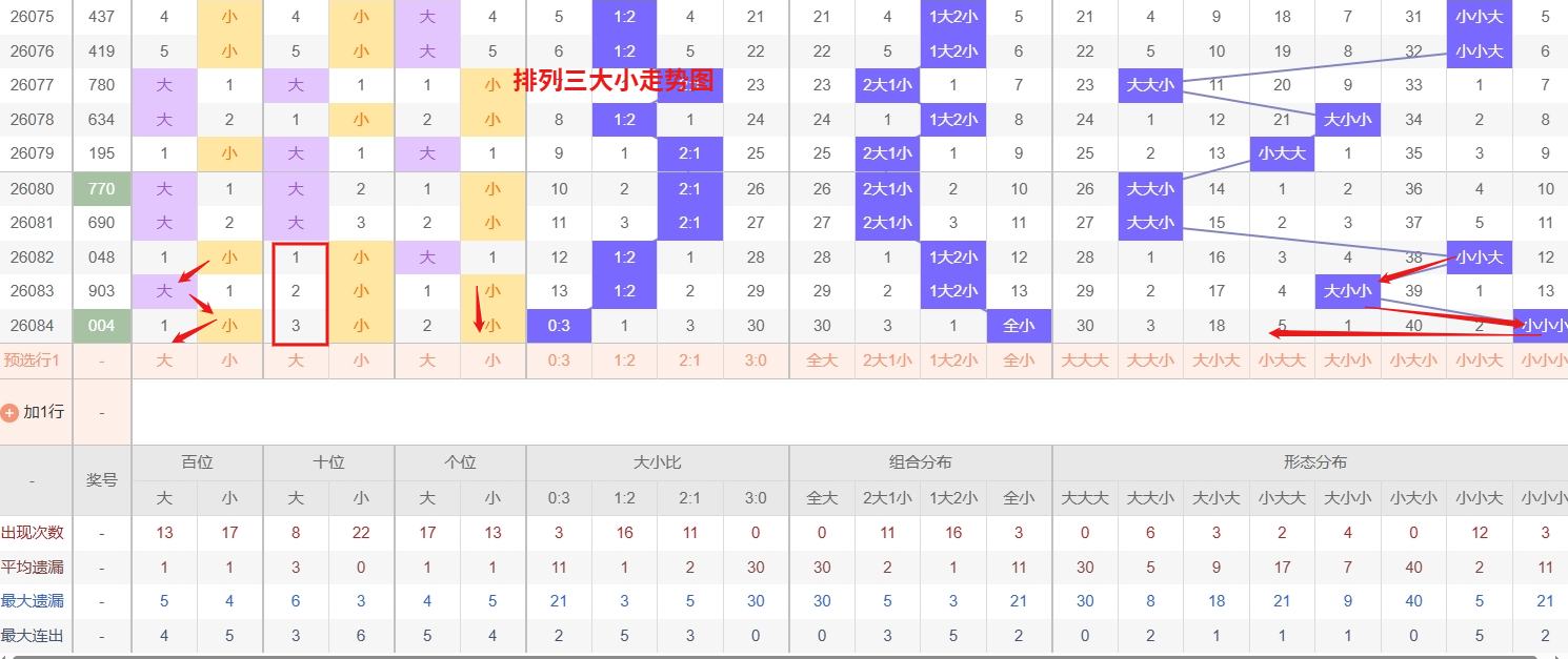 排列三 大小形态分析:从大小走势图上可以看出排列三100期内百位大小比约为51比49,十位大小比约为48:52,个位大小比约为55比45,除了个位和百位奇数比偶数多,十位偶数比奇数多。历史数据近2期开出小小小下一期的走势为,第003期开小小小后第004期开大大大。第012期开出小小小后第013期开大大小,第035期开出小小小后036期开小大小。 排列三大小走势中,近期大大小作为热号形态连续活跃,出号频率明显高于其他组合,从热态惯性和短期趋势来看,该形态仍有连下的可能,尤其在百位、十位同时走大的局面下容易再次出现;与此同时,大大大则属于当前冷号,已遗漏多期未出,从历史回补规律和极端值修复的角度分析,其反弹需求正在积累,未来几期需防范该冷态突然开出的可能。 所以排列三第2026085期大小形态推荐大大小大大大本文由一起彩钱是生命动力所著,请勿转载