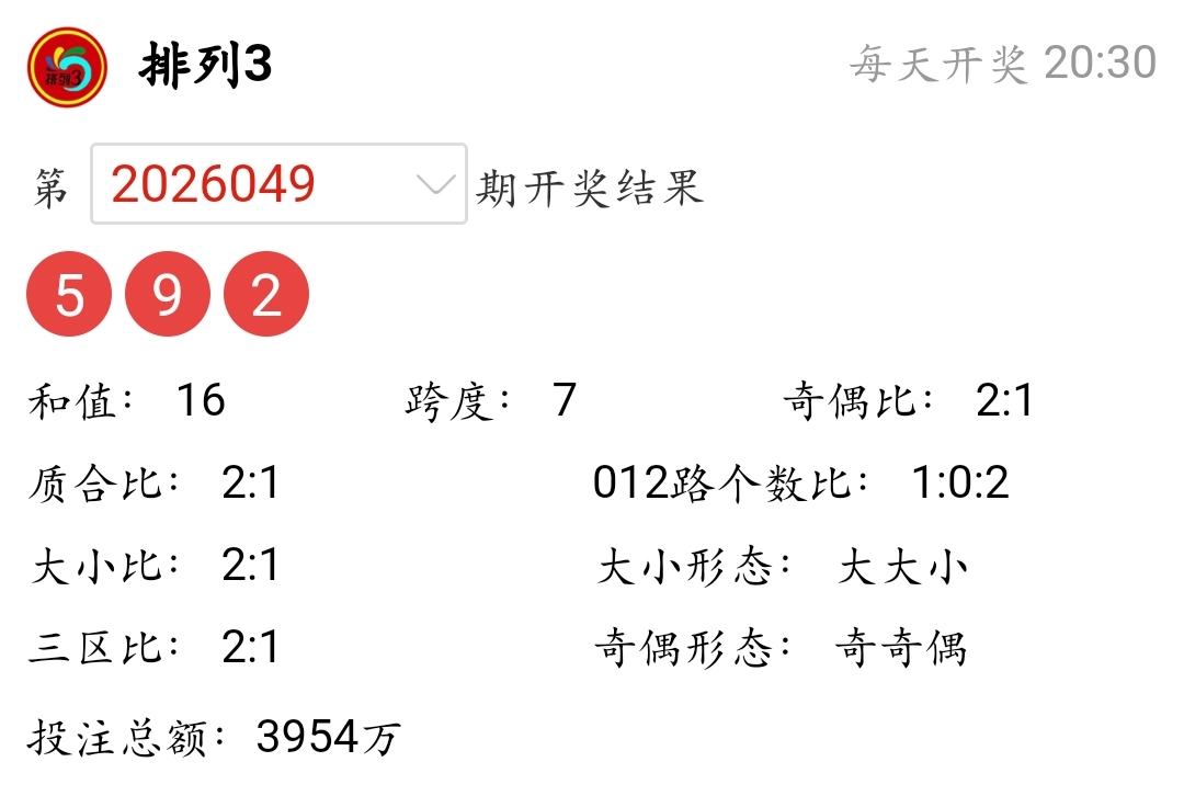 排列3上期开出两奇一偶5、9、2,跨度:7,和值:16,奇偶比:2:1,质合比:2:1 ,大小形态:大大小,三区比:2:1, 012路个数比:1:0:2