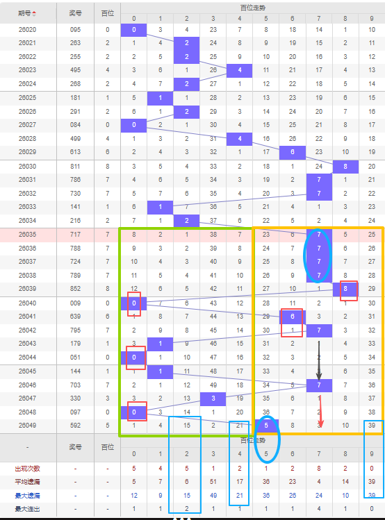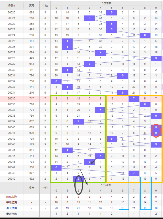 体彩排列3第2026050期的个位首先分析奇偶数号,如图所示近15期开出了9期奇数6期偶数,开出奇数概率比开出偶数概率大,那么上期开出了偶数号,本期可以关注偶数号,建议考虑遗漏期数较大的偶数。比如偶数6号8号都已经遗漏十期以上,且均以到达其最大遗漏期数,建议防冷号开出。