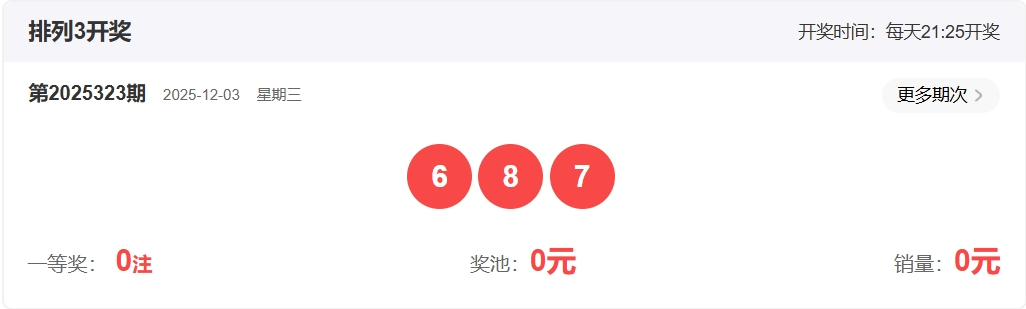 排列三第2025323期开奖回顾:开奖号码:687   形态:组六