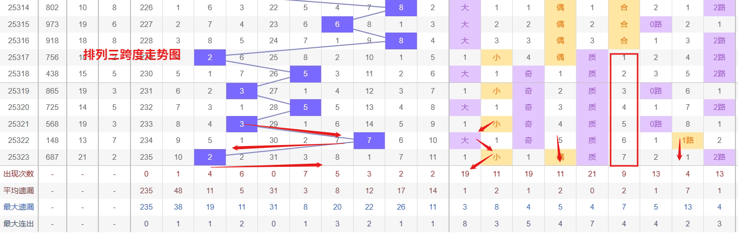 排列三 跨度分析:从上图可以看出近100期的跨度大小比约为46比54,跨度奇偶比约为47比53总体来看还是比较均衡的,但跨度大小之间有点差异。我们再从历史开出2跨后下一期5跨度数据来做参考。最近10期跨度大小比约为4:6期开出大数跨度过多返回小数跨度的概率更高一点。历史开奖近2期出2跨以后的走势为248期开出2跨后下一期走4跨走出2振幅,第264期开出2跨后下一期走5跨走出3振幅第285期开出2跨后下一期开出9跨走出7个振幅。连续多期大振幅,近期排列三跨度走势来看,跨度4作为冷号已遗漏长达31期,其回补压力正在急剧累积,当前阶段点防范。与此同时,跨度3和跨度5作为近期热号,表现出较强的活跃度,形态上存在继续连下的可能。整体格局呈现出“热者恒热、冷极必返”的典型特征,走势可能进入冷热交替的关键节点。采取热号跟踪与冷号防守相结合的方式,既要关注3跨与5跨的热态延续性,更要警惕跨度4在长期遗漏后可能出现的强势回补,本期预计跨度遵从历史会走出大振幅,出2跨度后容易走出1到6个跨度振幅的对称形态,跨度走出1到6个振幅看好的跨度有3459跨,所以第2025324期排列三跨度推荐3459跨。