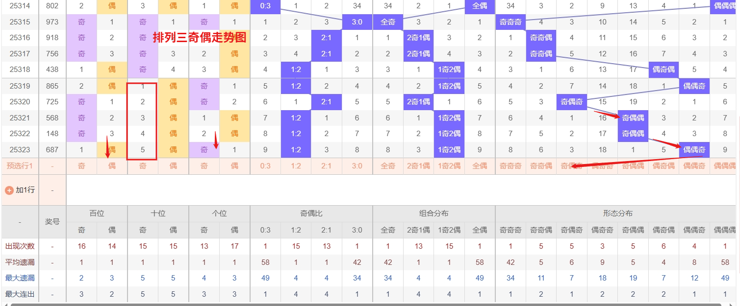 排列三 奇偶分析:从上图可以看出排列三100期内百位奇偶比约为55比45,十位奇偶比为49比51,个位奇偶比为54比46,十位的比值比较均衡,但是个位的比值偏差就有点大,历史奇偶形态近2期开出偶偶奇后下一期的走势为,第247期开出偶偶奇后248期开偶偶偶, 第266期开出偶偶奇后第267期开奇奇奇,第285期开出偶偶奇后第286期开偶奇奇,近期排列三奇偶形态走势分析,在“偶偶奇”组合开出之后,历史轨迹显示形态往往倾向于打破均衡,短期内开出全偶或全奇这类极端组合的概率显著增大。这标志着奇偶分布可能正进入一个从分散转向集中的关键窗口期。尤其值得注意的是,全偶与全奇作为长期未出的两大冷态组合,其遗漏值已累积至高位,冷态回补的压力与日俱增。所以排列三2025324期奇偶形态推偶奇奇与偶偶偶。