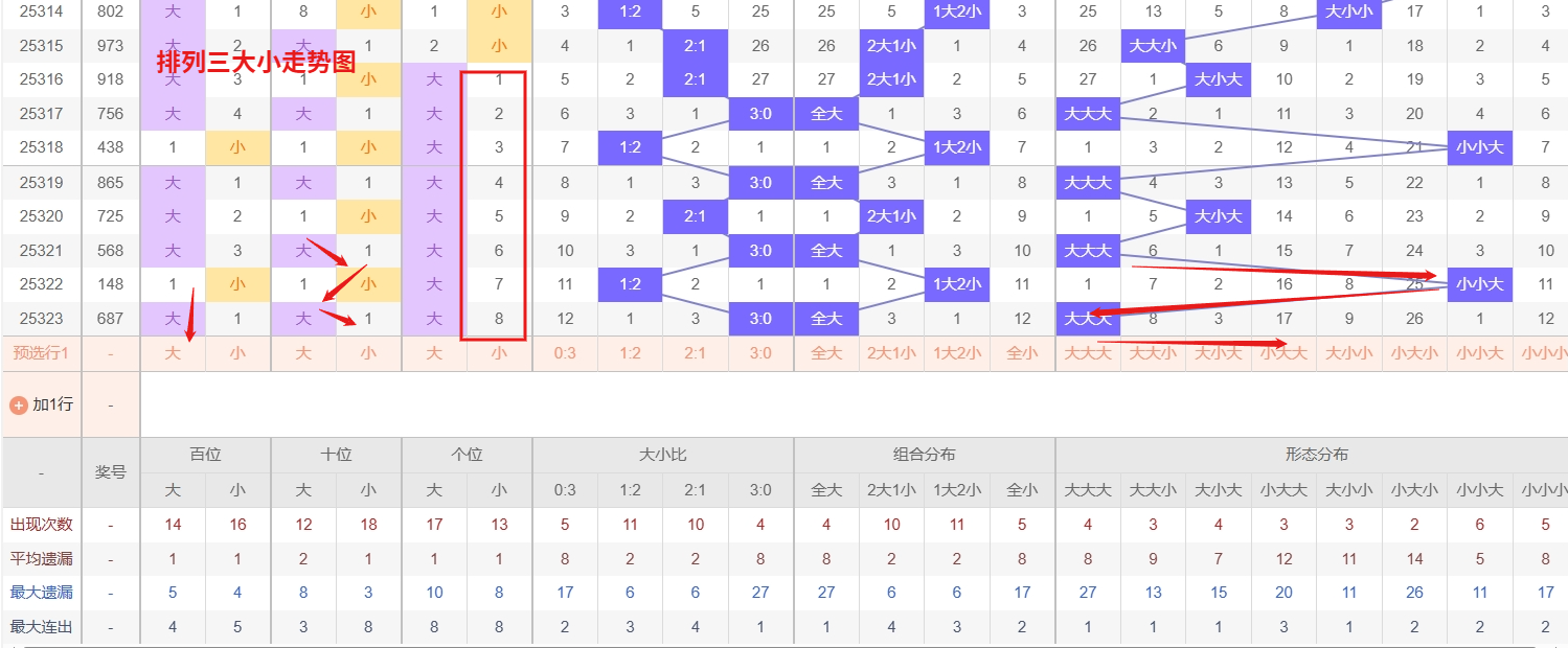 排列三 大小形态分析:从大小走势图上可以看出排列三100期内百位大小比约为55比45,十位大小比约为49:51,个位大小比约为53比47,除了个位和百位奇数比偶数多,十位是偶数比奇数多。历史数据近2期开出大大大下一期的走势为,第242期开出大大大第243期开大大小。第263期开出大大大后第264期开小大小,第274期开出大大大后275期开小大大。近期排列三大小形态走势观察,小大小平均遗漏26期,已进入明显冷态,其长期遗漏带来了不容忽视的回补压力。与此同时,与其结构关联紧密的“大大小”与“小大大”组合虽处温号区间,但其出现频率正显示出蓄势待发的转热征兆。这种冷、温形态的并存在往预示着格局切换的关键节点——冷态“小大小”的回归可能带动的联动发热。所以排列三第2025324期大小形态推荐小大小大大小