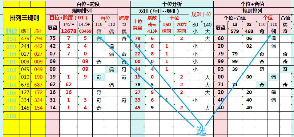 规则排列中,根据“十位”数字奇、大小律特征,与标准排列的十位数字并集分析,其中十位数字相同的150注,不相同的70注,这一特点具有实用价值。