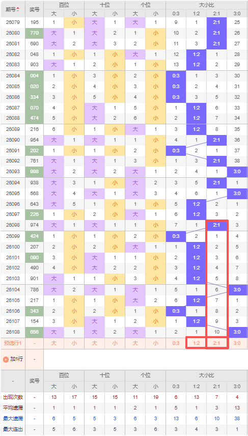 上期大小比:3:0,近10期大小比出现情况:2:1、0:3、1:2、1:2、1:2、1:2、3:0、1:2、0:3、1:2、3:0,最近10期出0期2:1,出现6期1:2,出现2期0:3,出现2期3:0,根据近10期出号规律本期推荐隔期的1:2,防遗漏10期出2:1,综上所述大小比推荐:2:1,重点关注:1:2。