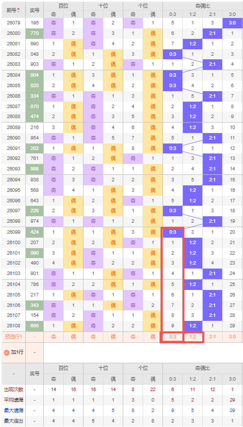 上期奇偶比:1:2,近10期奇偶比出现情况:1:2、1:2、1:2、2:1、2:1、1:2、2:1、2:1、2:1、1:2,最近10期出现4期2:1,出现5期1:2,出现1期0:3,出现0期3:0,根据近10期出号规律本期推荐遗漏9期出0:3,防连出1:2,综上所述奇偶比推荐:1:2,重点关注:0:3。