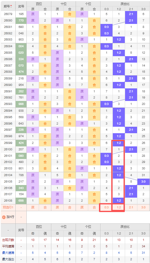 2026108期排列三条件分析:(和值、大小比、奇偶比、质合比):