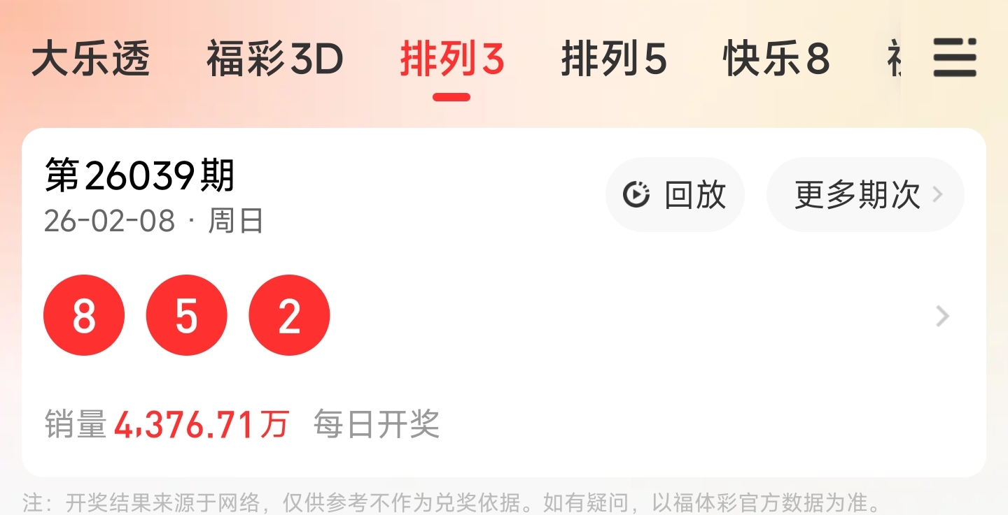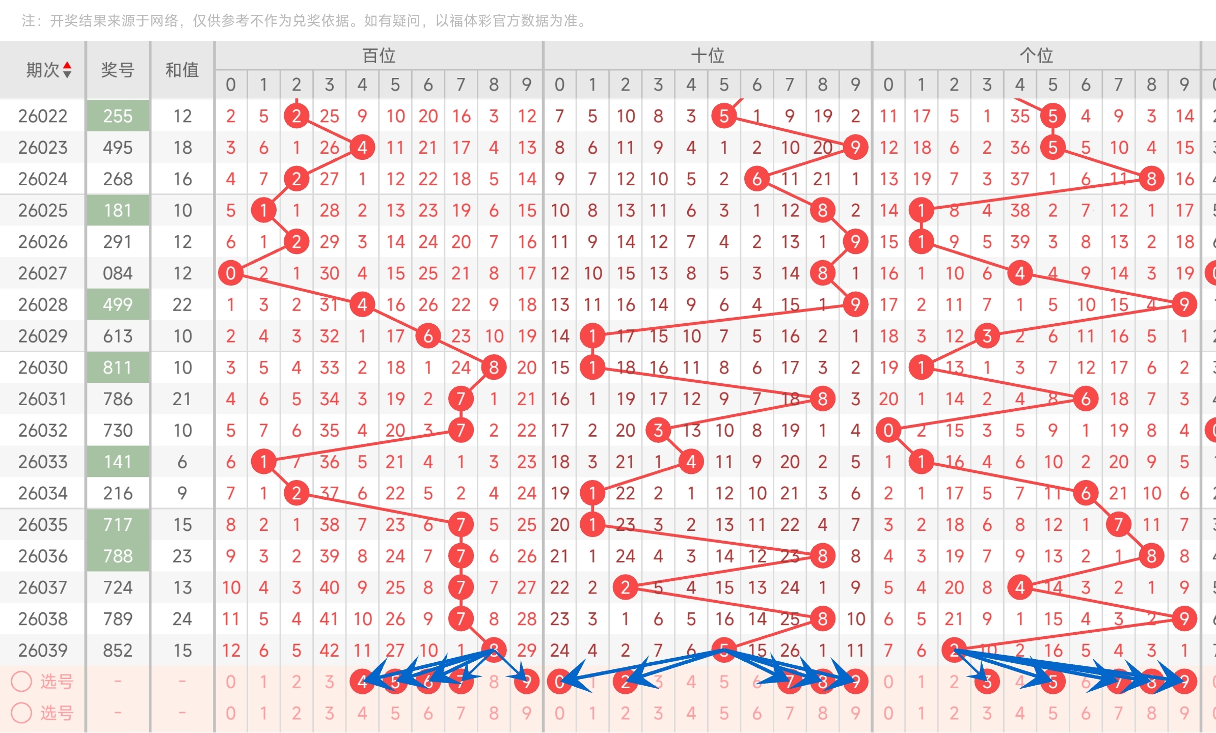 上期排列3开出852,和尾为5,跨度为6,奇偶比为1:2,大小比为2:1012路个数对比为0:0:3