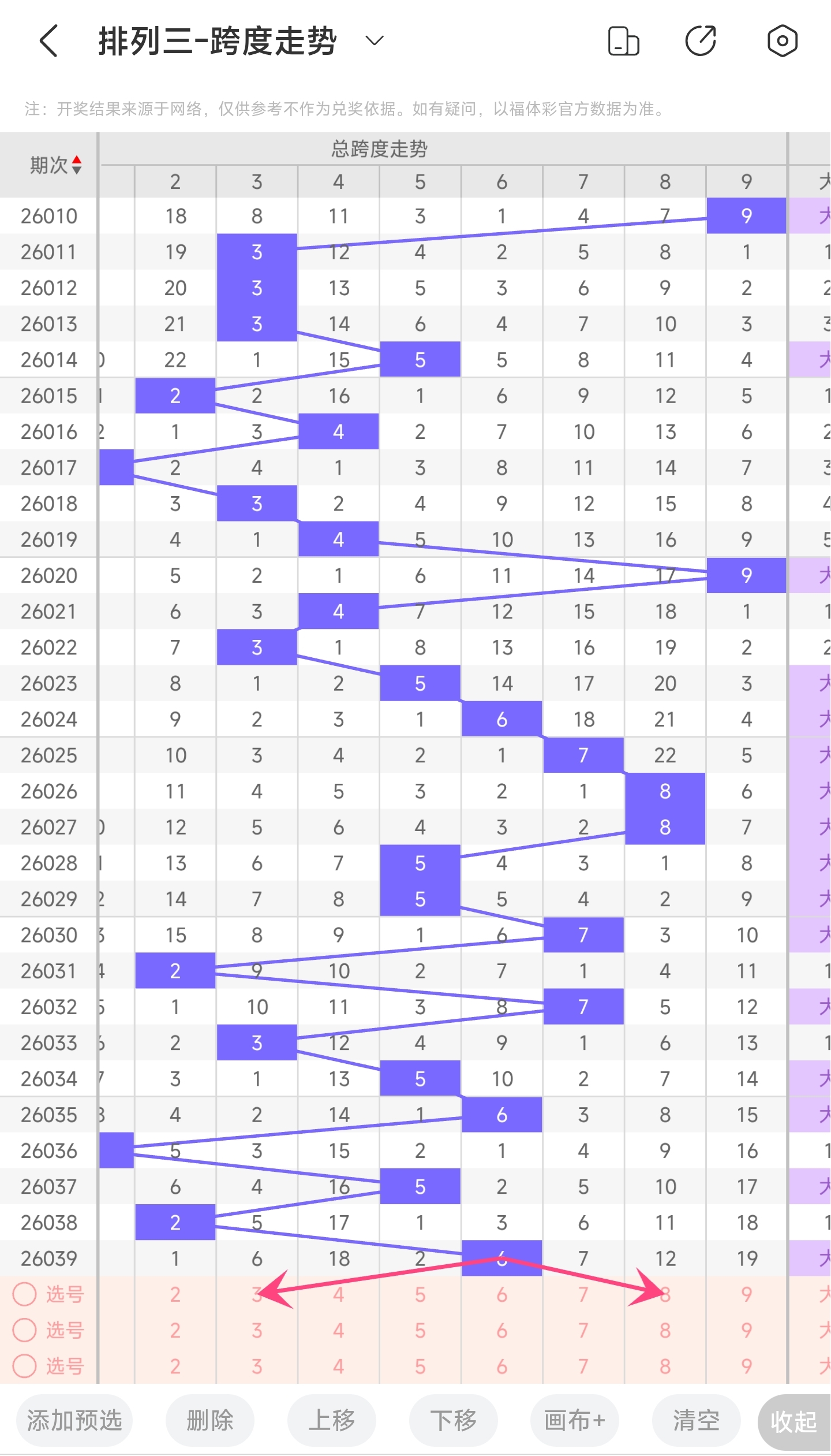 上期跨度为6,往前一期跨度是2,趋势往右移动,偏移量为4。跨度值6时,跨度值是近30期开出中间的值。通过走势图分析,目前的趋势是可能往左也可能往右。所以推测本期跨度可能为23478等跨度。