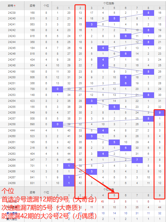 上期个位:1,近10期个位出号:4 3 5 6 4 7 1 3 1 1。最近10期大小变化分别:小小大大小大小小小小,奇偶变化分别:偶奇奇偶偶奇奇奇奇奇,质合变化分别:合质质合合质质质质质,根据近10期出号规律上期重开出1号(小奇质),本期个位首选冷号遗漏12期的9号(大奇合),次选遗漏7期的5号(大奇质),防遗漏42期的大冷号2号(小偶质),综上所述个位出号推荐5个号码:9 5 4 3 2(出号概率由高排到低)。