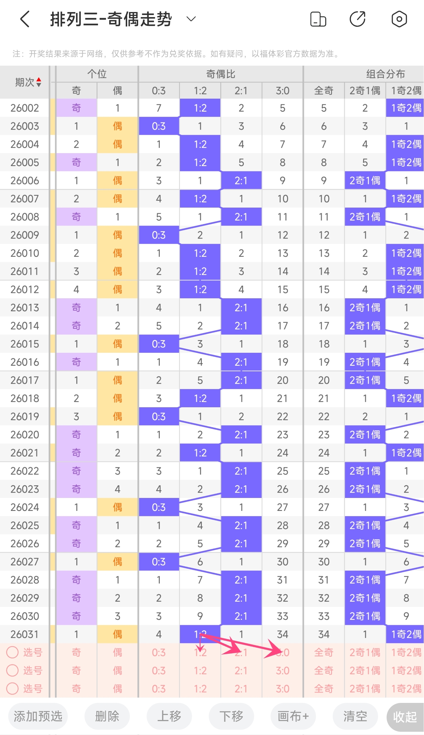 上期开出了1:2的奇偶比。往前一期是2:1奇偶比。通过分析奇偶走势图,近30期内开出1:2奇偶比的次数是10次,开出2:1奇偶比的次数是14次,3:00次,0:36次。和前一期相比,次数没有变化。通过走势图分析,上期开1:2奇偶比,本期看好2:1奇偶比。所以推测本期可能开2:1奇偶比,其次是1:2奇偶比,最后是3:0或者0:3奇偶比。