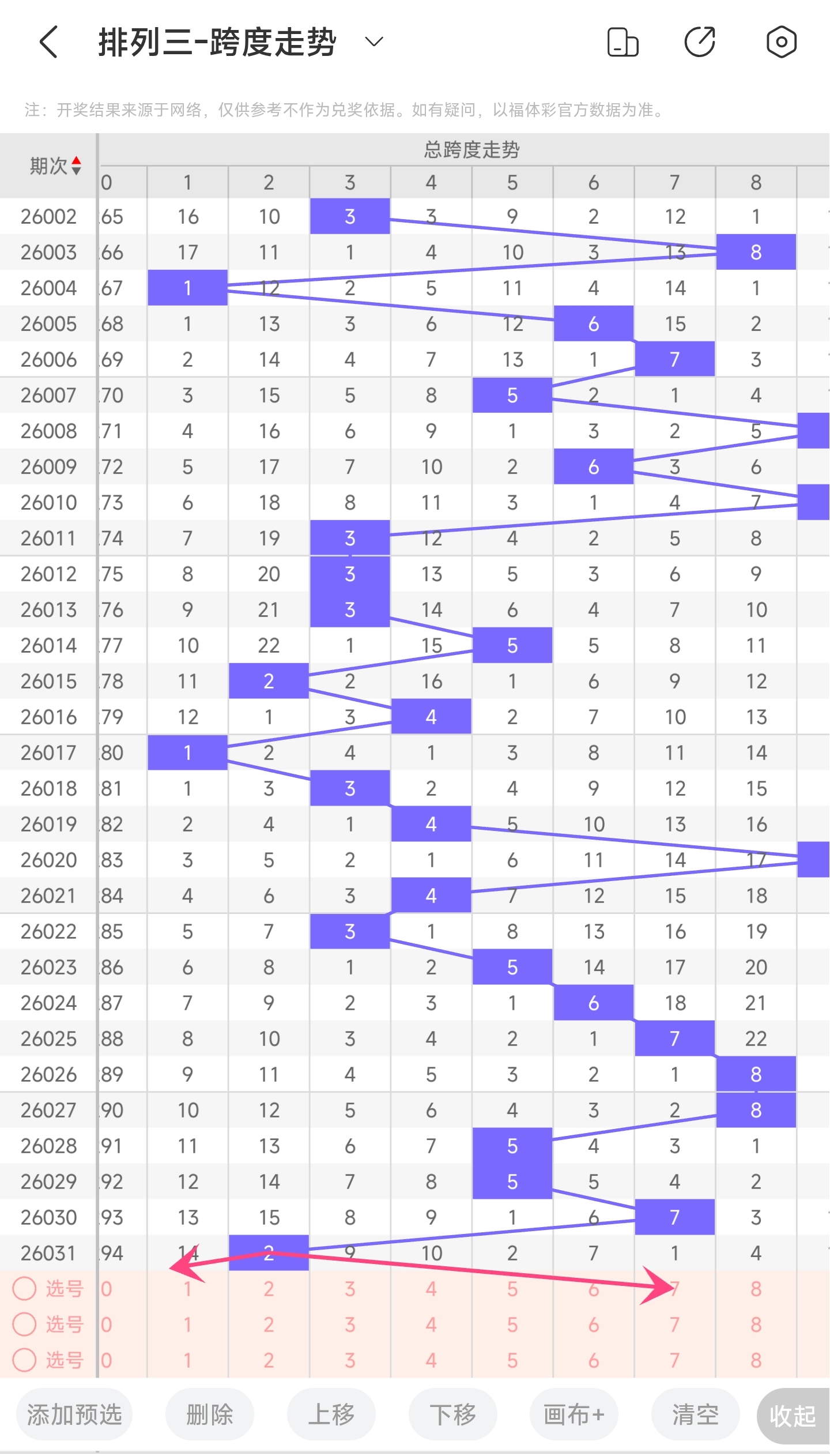 上期跨度为2,往前一期跨度是7,趋势往左移动,偏移量为5。跨度值2时,跨度值是近30期开出比较小的值。通过走势图分析,目前的趋势是大概率往右,小概率往左。所以推测本期跨度可能为34567等跨度。