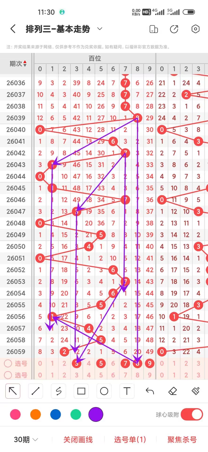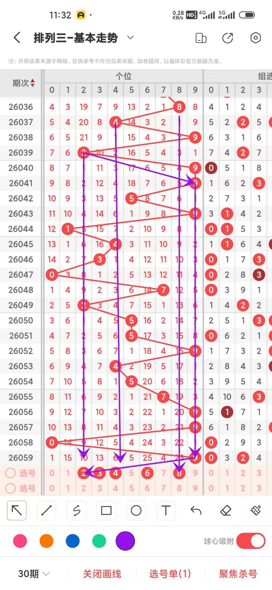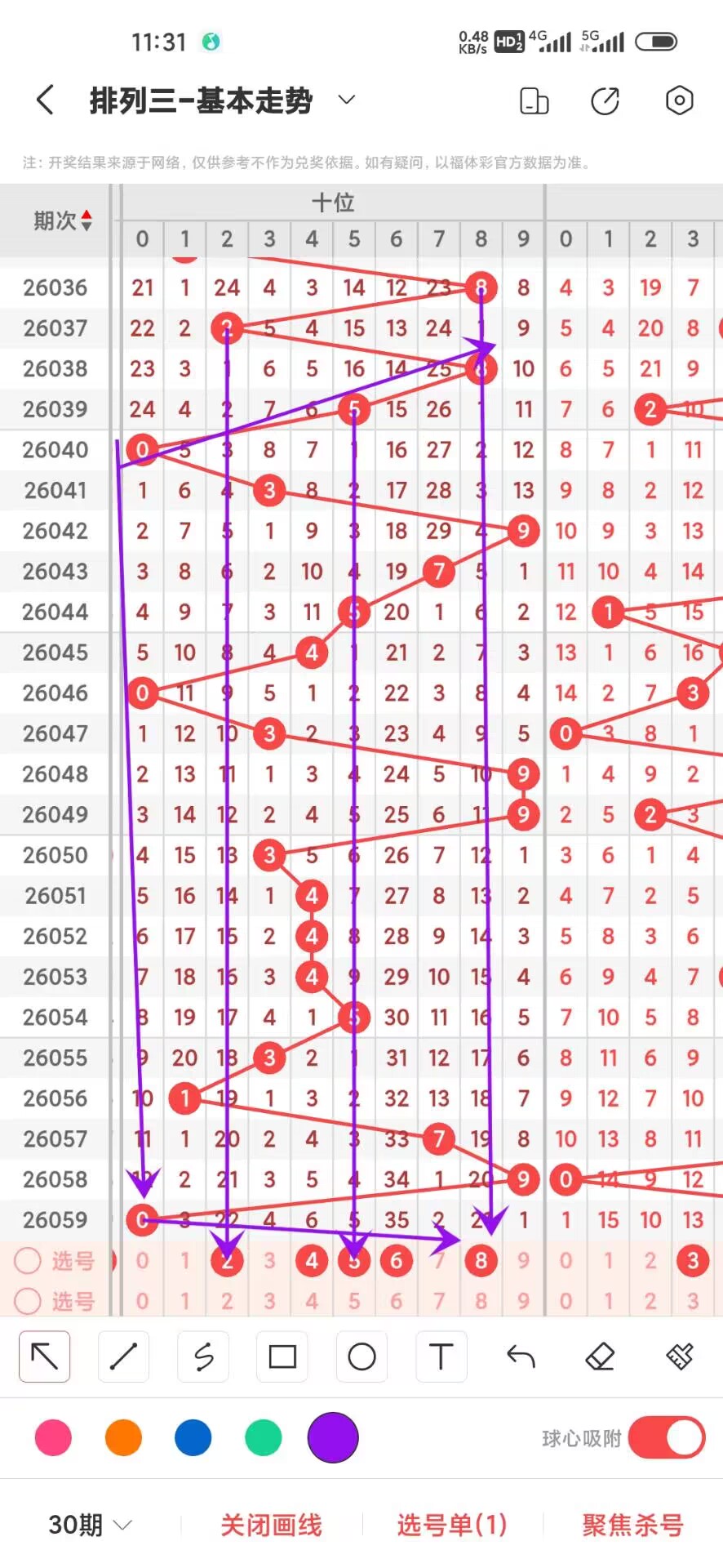 2026060期上期百位开出偶数2,我们通过走势图来看百位上300期,0-9下号数据和最大遗漏数据,其中0出现30次,1出现37次,2出现37次,3出现20次,4出现27次,5出现29次,6出现31次,7出现34次,8出现34次,9出现21次,0-9目走势差别不大,我们在回过头来看最大遗漏下号,0遗漏55次,1遗漏23次,2遗漏26次,3遗漏49次,4遗漏31次,5遗漏52次,6遗漏26次,7遗漏36次,8遗漏29次,9遗漏49次,目前遗漏中035遗漏最大,通过上面的走势分析我们可以看出目前百位上走势比较好的号码是小号,我们可以关注下,893号码走势就有点冷淡,我们可以防守,今天百位我们重点关注35789,具体看下面走势图