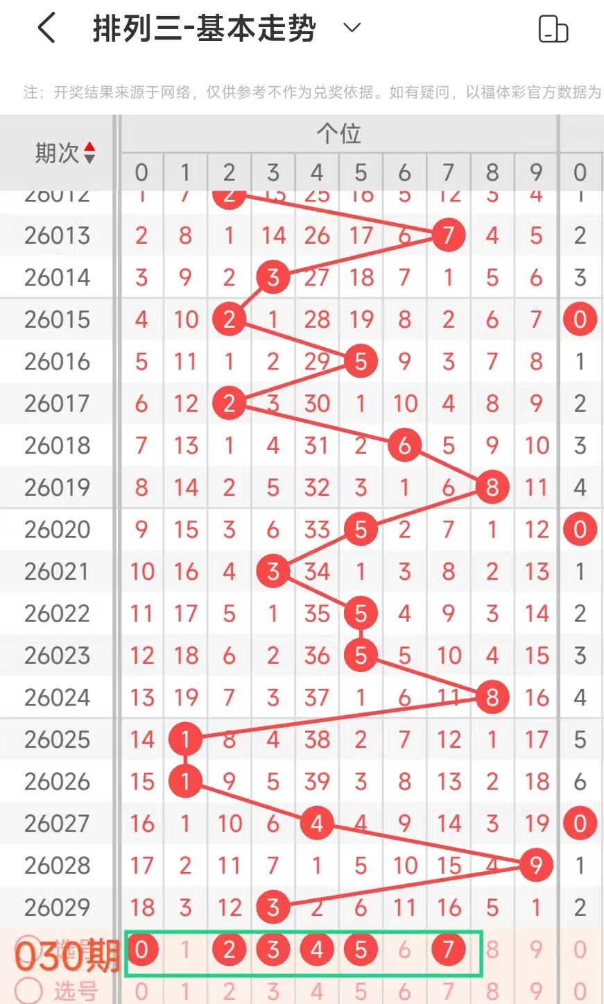 近10期开奖遗漏值分别 6 1 0 4 19 0 39 19 7,奇偶属性分别为:偶奇偶偶奇偶奇奇奇,奇后可能出偶,而偶数遗漏值的有023457,本期不妨考虑一下。