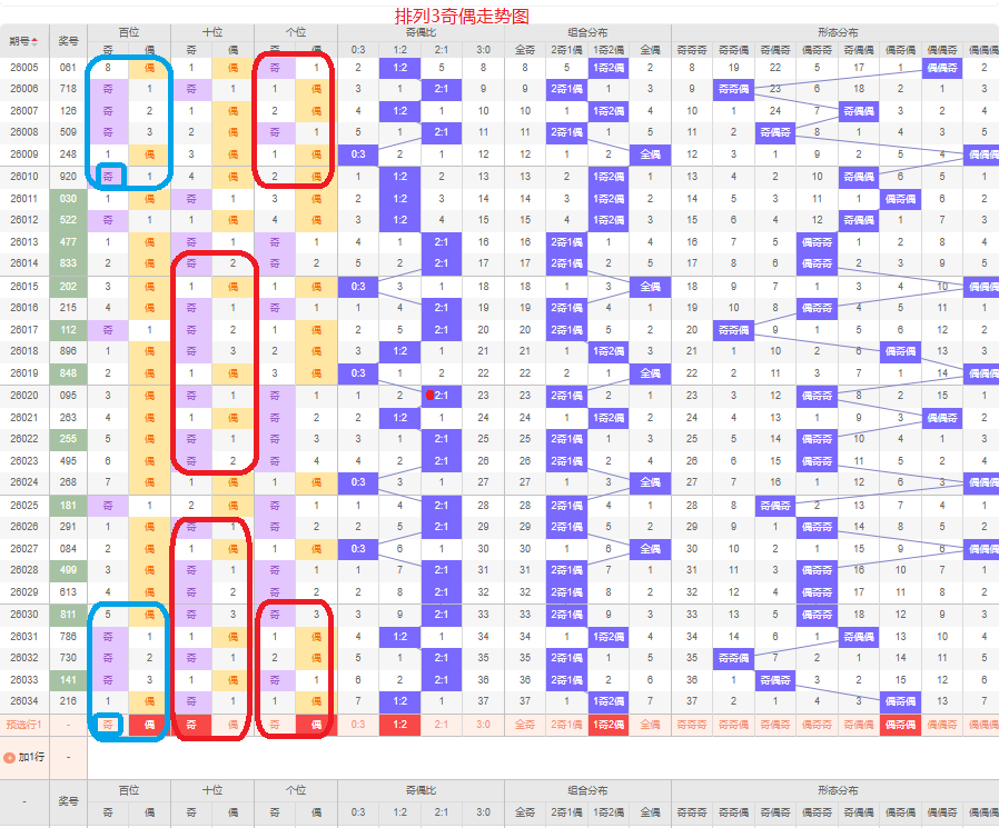 上一期的奇偶比为1:2,两偶的号码组合,从近五期的奇偶数出现情况看,奇数出8次,偶数出现7次,奇数偶数号码出现较多,本期要侧重两偶的号码组合,侧重偶奇偶或奇奇偶的号码组合,根据奇偶组合形态可做五码定位02468/13579/02468或13579/13579/02468