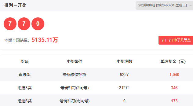 排列3上期(2026080期)开奖号码详情