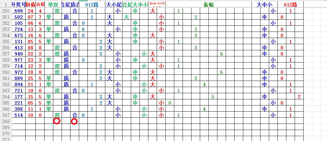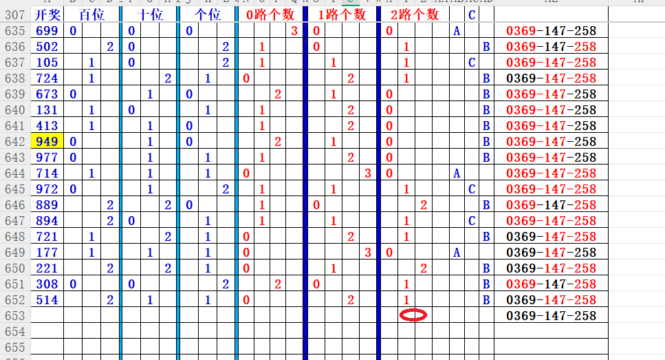 如上图56,012路分析0路出号的概率还是很大,本期可以从0路号入手做胆0369中选;看好369胆码。