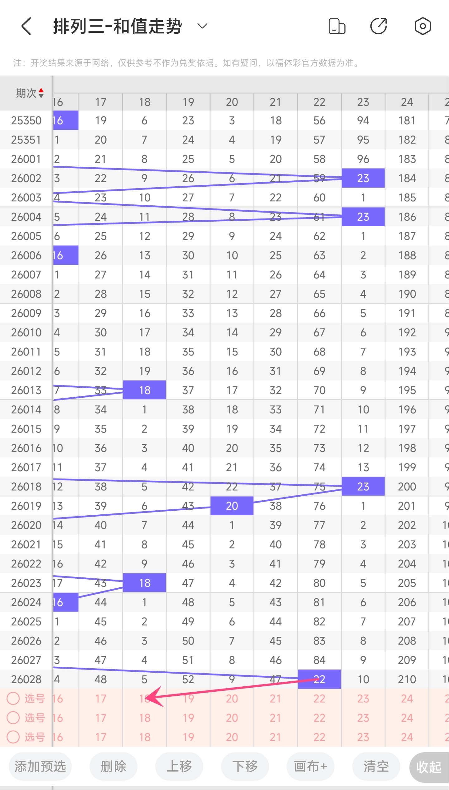 上期和值为22,往前一期和值为12,趋势往右移动,偏移量为10。通过走势图分析,22和值是近30期内开出比较大的和值,下降空间比较大,上升空间比较小。本期看好和值变小,因此推测本期趋势是往左的,和值会变小,小概率往右,和值变大。