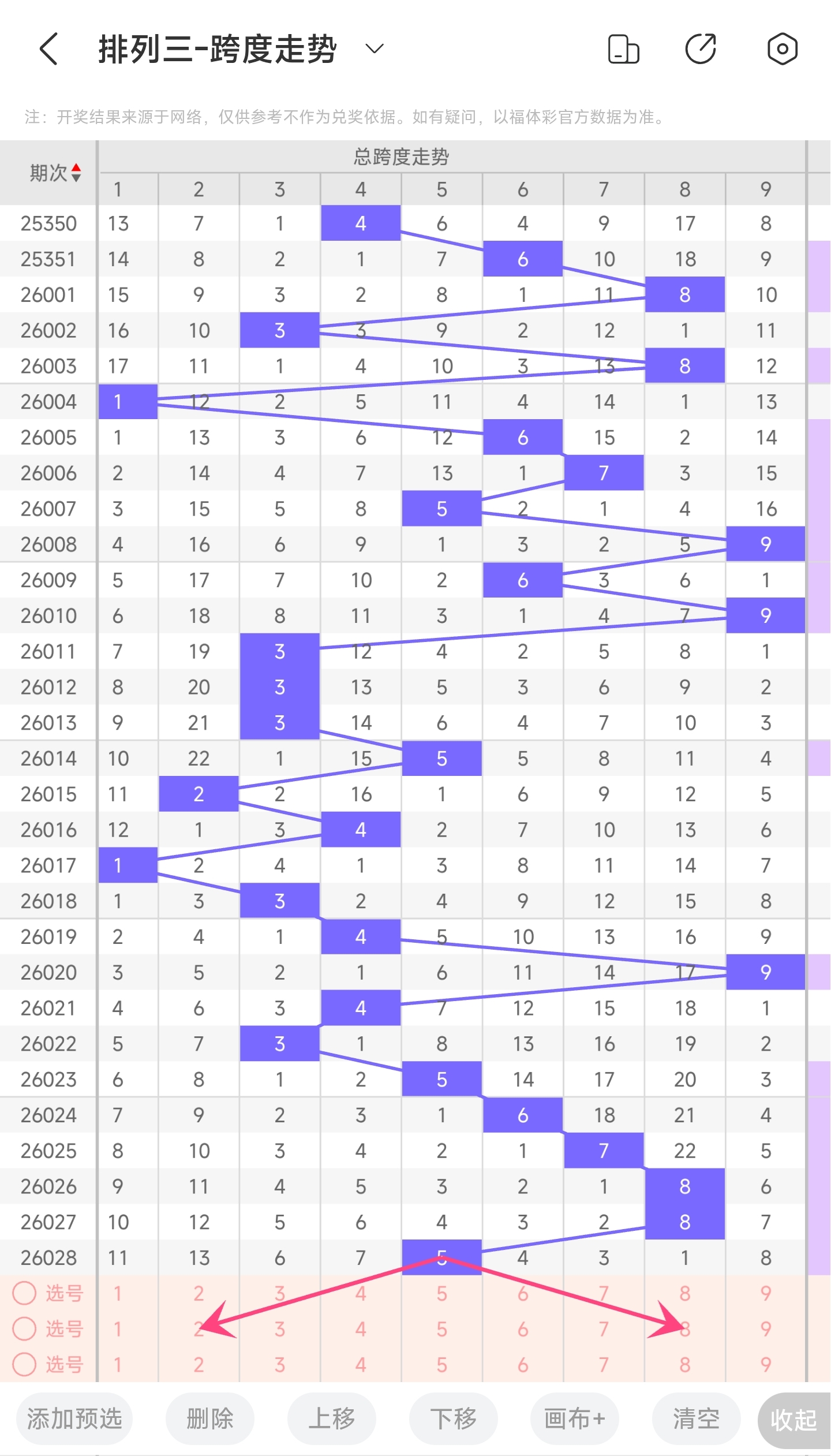 上期跨度为5,往前一期跨度是8,趋势往左移动,偏移量为3。跨度值5时,跨度值是近30期开出中间的值。通过走势图分析,目前的趋势是可能往左也可能往右。所以推测本期跨度可能为23478等跨度。