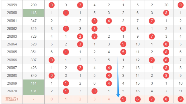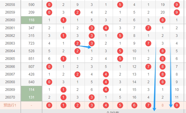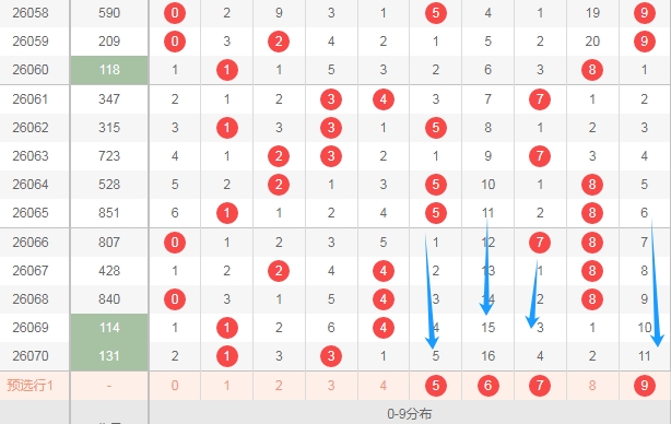 上图是体彩排列三开奖号码走势分布图,我标志出来的数字56789这个区域有5个,这个区域连续两期没出现号码,那么本期这个区域出号码的机会是有的,关注数字56789出一个或者两个,防出三个。
