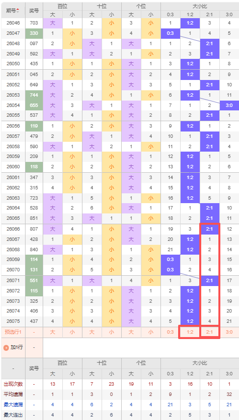 上期大小比:1:2,近10期大小比出现情况:2:1、1:2、1:2、0:3、0:3、2:1、1:2、1:2、1:2、1:2,最近10期出2期2:1,出现6期1:2,出现2期0:3,出现0期3:0,根据近10期出号规律本期推荐遗漏4期的2:1,防五连出1:2,综上所述大小比推荐:防:1:2,重点关注:2:1。