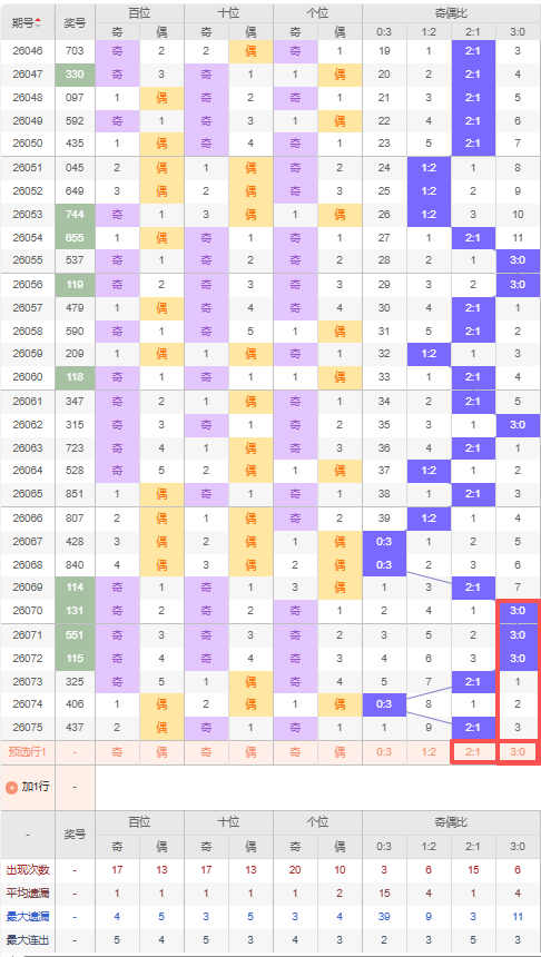 上期奇偶比:2:1,近10期奇偶比出现情况:1:2、0:3、0:3、2:1、3:0、3:0、3:0、2:1、0:3、2:1,最近10期出现3期2:1,出现1期1:2,出现3期0:3,出现3期3:0,根据近10期出号规律本期推荐连出2:1,防遗漏3期出3:0,综上所述奇偶比推荐:防:3:0,重点关注:2:1。