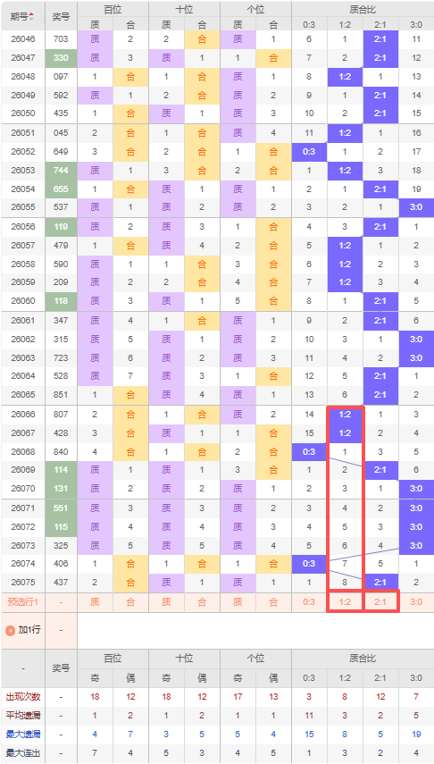 上期质合比:2:1,近10期质合比出现情况:1:2、1:2、0:3、2:1、3:0、3:0、3:0、3:0、0:3、2:1,最近10期出现2期2:1,出现2期1:2,出现2期0:3,出现4期3:0,根据近10期规律本期推荐连出2:1,防遗漏8期出1:2,综上所述质合比推荐:防:1:2,重点关注:2:1。