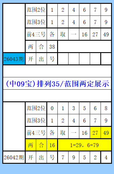 上期26042期开奖795,和值21,跨度4,两码组合包括57、59、79,两码和尾2、4、6,和尾1。