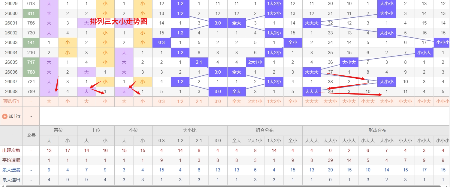 排列三 大小形态分析:从大小走势图上可以看出排列三100期内百位大小比约为48比52,十位大小比约为47:53,个位大小比约为55比45,除了个位奇数比偶数多,十位和百位偶数比奇数多。历史数据近2期开出大大大下一期的走势为,第314期开出大大大第315期开小小大。第322期开出大大大后第323期开小大小,第334期开出大大大后335期开大大小。排列三大小走势中,大大小组合已遗漏39期,处于深度冷态,从概率均衡与历史回补规律来看,此类冷组合已积累较强的回补势能,值得重点关注其解冻信号。而小大小组合则持续热出,呈现明显的热态延续,短期内仍需作为防守重点。整体上,大小走势呈现典型的冷热对峙格局,采取防热追冷的策略:在紧盯小大小热号连开可能的同时,逐步布局大大小冷号的回补机会,所以排列三第2026039期大小形态推荐大大小防小大小。