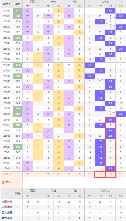 上期大小比:2:1,近10期大小比出现情况:2:1、1:2、2:1、2:1、1:2、1:2、1:2、1:2、1:2、2:1,最近10期出4期2:1,出现6期1:2,出现0期0:3,出现0期3:0,根据近10期出号规律本期推荐隔期出1:2,防连出2:1,综上所述大小比推荐:防:2:1,重点关注:1:2。