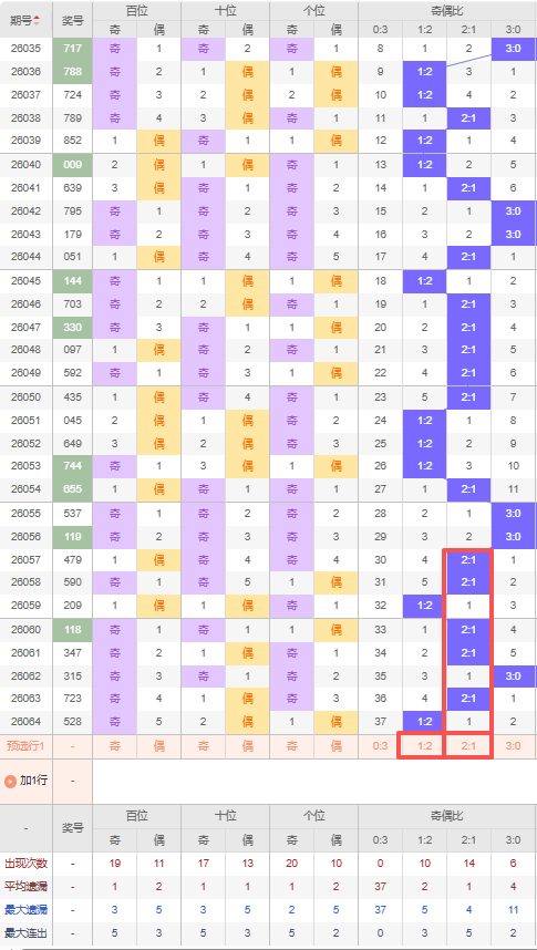 上期奇偶比:1:2,近10期奇偶比出现情况:3:0、3:0、2:1、2:1、1:2、2:1、2:1、3:0、2:1、1:2,最近10期出现5期2:1,出现2期1:2,出现0期0:3,出现3期3:0,根据近10期出号规律本期推荐连出1:2,防隔期出2:1,综上所述奇偶比推荐:防:2:1,重点关注:1:2。