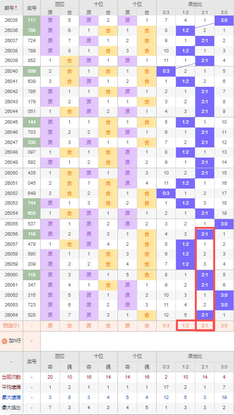上期质合比:2:1,近10期质合比出现情况:3:0、2:1、1:2、1:2、1:2、2:1、2:1、3:0、3:0、2:1,最近10期出现4期2:1,出现3期1:2,出现0期0:3,出现3期3:0,根据近10期规律本期推荐遗漏5期出1:2,防连出2:1,综上所述质合比推荐:防:2:1,重点关注:1:2。