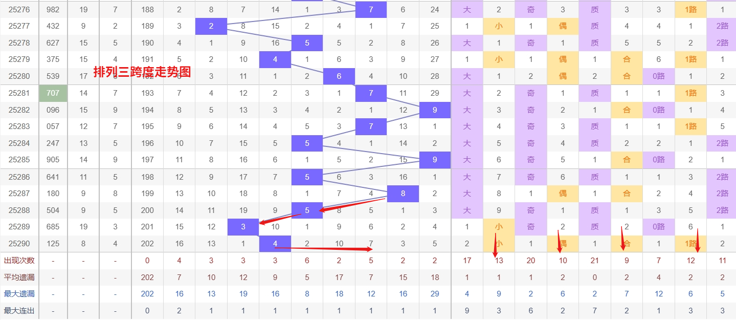排列三 跨度分析:从上图可以看出近100期的跨度大小比约为53比47,跨度奇偶比约为49比51总体来看还是比较均衡的,但跨度大小之间有点差异。我们再从历史开出4跨后下一期2跨度数据来做参考。最近10期跨度大小比约为5:5期开出大数跨度过多返回小数跨度的概率更高一点。历史开奖近2期出4跨以后的走势为207期开出4跨后下一期走2跨走出2振幅,第218期开出4跨后下一期走7跨走出3振幅第228期开出4跨后下一期开出6跨走出2个振幅。连续多期小振幅。近期排列三跨度走势的详细分析,7跨已进入明显的热态阶段,其出现频率显著增高,且从形态分布上看呈现出强劲的连续性,这种强势状态在短期内具有持续动能,存在较高的连下可能性,是当前需要重点跟踪关注的对象;与此同时,6跨则持续低温,遗漏期数不断累积,形成了典型的冷态特征,从概率均衡与冷号回补的规律来看,这种长期冷寂的跨度往往具备随时解冻开出的潜力,采取冷热兼顾的思路,在优先跟进7跨热号连下趋势以追逐热态收益的同时,务必对6跨冷号进行有效防守,综合以上分析后得出,本期预计跨度遵从历史会走出小振幅,出4跨度后容易走出2到4个跨度振幅的对称形态,跨度走出2到4个振幅看好的跨度有1267跨,所以第2025291期排列三跨度推荐1267跨。