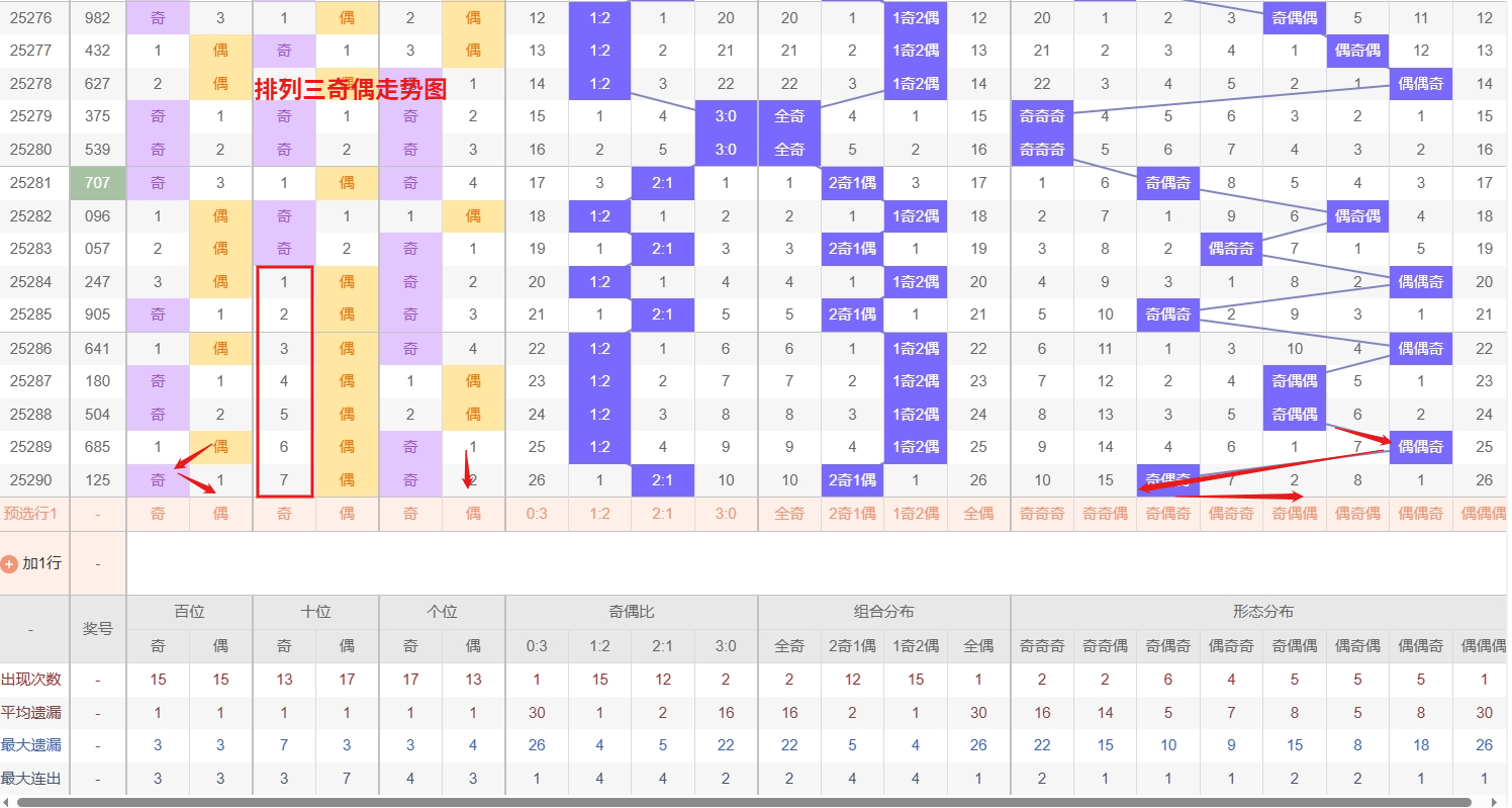 排列三 奇偶分析:从上图可以看出排列三100期内百位奇偶比约为46比54,十位奇偶比为49比51,个位奇偶比为45比55,十位的比值比较均衡,但是个位的比值偏差就有点大,历史奇偶形态近2期开出奇偶奇后下一期的走势为,第205期开出奇偶奇后206期开偶奇偶, 第217期开出奇偶奇后第218期开偶偶奇,第223期开出奇偶奇后第224期开偶奇奇,近期排列三奇偶走势分析,偶奇偶和偶偶奇组合已进入明显的热态阶段,出现频率显著增高且形态稳定,从走势的连续性与热度惯性来看,这两种组合在短期内仍有较大概率的连下可能,是当前需要重点跟踪关注的对象;然而,奇偶分布始终遵循动态平衡的规律,热态持续越久,其转折风险也相应累积,在重点跟进热号连下趋势的同时,也需对可能出现的奇偶比例回调保持警惕,所以排列三2025291期奇偶形态推偶奇偶与偶偶奇。