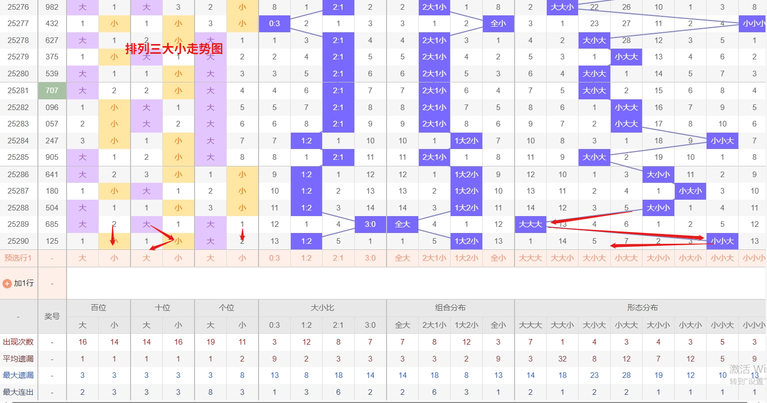排列三 大小形态分析:从大小走势图上可以看出排列三100期内百位大小比约为46比54,十位大小比约为47:53,个位大小比约为52比48,除了个位奇数比偶数多,十位和百位是偶数比奇数多。历史数据近2期开出小小大下一期的走势为,第204期开出小小大第205期开小小小。第214期开出小小大后第215期开大大小,第226期开出小小大后227期开大大大。近期排列三大小形态走势分析,“大大大”组合已进入明确的强势热态,不仅出现频次显著增高,且形态上呈现出强劲的连续出号势头,短期内存在极高的连下可能性,而“大大小”组合则持续低温,遗漏值逐步累积至冷态区间,按照冷号回补规律,其解冻反弹的风险正在不断加大,须予以严密防范;与此同时,“小小小”作为温态组合,虽未进入极端冷热区间,但其稳定性与间歇出号的特点同样具备随时爆发的潜力。所以排列三第2025291期大小形态推荐小小小防大大大。