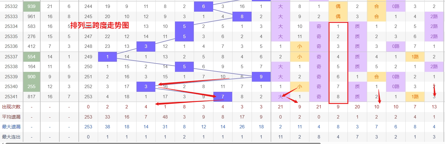 排列三 跨度分析:从上图可以看出近100期的跨度大小比约为48比52,跨度奇偶比约为45比55总体来看还是比较均衡的,但跨度大小之间有点差异。我们再从历史开出7跨后下一期3跨度数据来做参考。最近10期跨度大小比约为4:6期开出小数跨度过多返回大数跨度的概率更高一点。历史开奖近2期出7跨以后的走势为267期开出7跨后下一期走2跨走出5振幅,第272期开出7跨后下一期走8跨走1振幅第296期开出7跨后下一期开出3跨走出4个振幅。连续多期大振幅,近期排列三跨度走势分析,4跨已进入较冷阶段,其遗漏值逐步积累,历史回补规律提示冷跨通常不会长期缺席,但何时反弹仍需结合形态与周期进一步观察。而5跨则呈现明显热态,近期连续或间隔开出显示其正处于强势周期,从热跨惯性来看,短期内仍有连开或高频出现的可能,值得重点留意。整体而言,跨度冷热转换是常见现象,当前在防范5跨持续走热的同时,开始关注4跨的回补信号,本期预计跨度遵从历史会走出大振幅,出7跨度后容易走出1到5个跨度振幅的对称形态,跨度走出1到5个振幅看好的跨度有2358跨,所以第2025342期排列三跨度推荐2358跨。