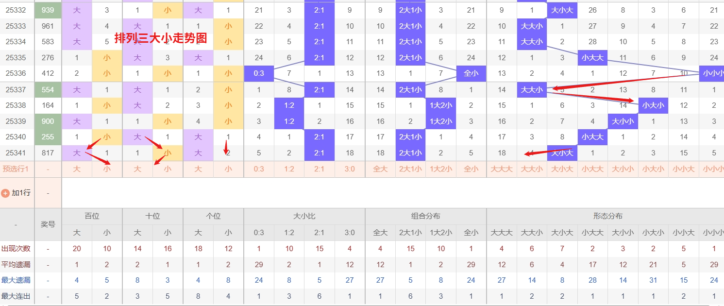 排列三 大小形态分析:从大小走势图上可以看出排列三100期内百位大小比约为48比52,十位大小比约为45:55,个位大小比约为54比46,除了个位奇数比偶数多,十位和百位是偶数比奇数多。历史数据近2期开出大小大下一期的走势为,第268期开出大小大第269期开小小大。第283期开出大小大后第284期开大大大,第296期开出大小大后297期开大小大。近期排列三大小走势分析,大大大与小小大形态双双进入热态阶段,呈现出较强的走势惯性。其中大大大作为全大形态,在经历一段活跃期后仍保持热度,而小小大则连续或高频开出,显示两者均受到近期大小分布偏态的支撑。从历史数据看,热态组合往往具有延续性,短期内再次开出或轮番表现的可能性较大,存在连下或交替走热的潜力。然而也需注意,过热形态通常会伴随阶段性回调,在关注其连下可能的同时,密切观察整体大小比的平衡趋势,所以排列三第2025342期大小形态推荐大大大防小小