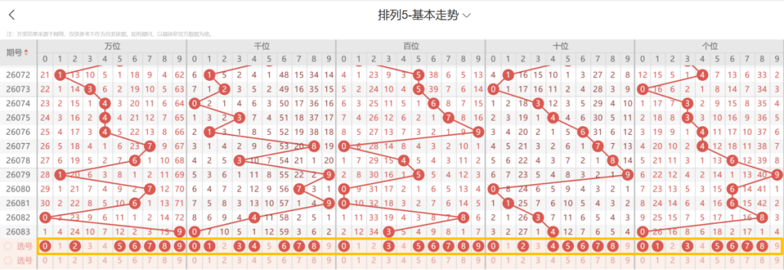 十位:083 期开 4(小偶 1 路,热号),近 10 期:1、0、4,小号偏多;0(连开)、4(热号);冷号:2(遗漏 19)、5(遗漏 12)、6(遗漏 19)、7(遗漏 10)、8(遗漏 12);路数:0 路(0/6)、1 路(4/7)、2 路(2/5/8)均衡;大小:大(5/6/7/8)+ 小(0/2/4),防大号回补;奇偶:奇(5/7)+ 偶(0/2/4/6/8),均衡。