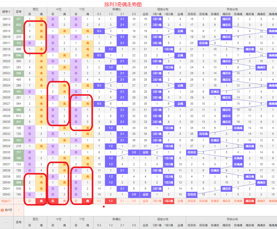 上一期的奇偶比为3:0,全奇的号码组合,从近五期的奇偶数出现情况看,奇数出9次,偶数出现6次,奇数号码出现较多,本期要侧重两偶的号码组合,侧重偶奇偶或偶奇奇的号码组合,根据奇偶组合形态可做五码定位02468/13579/02468或02468/13579/13579